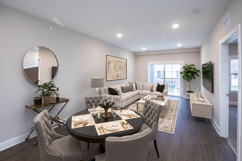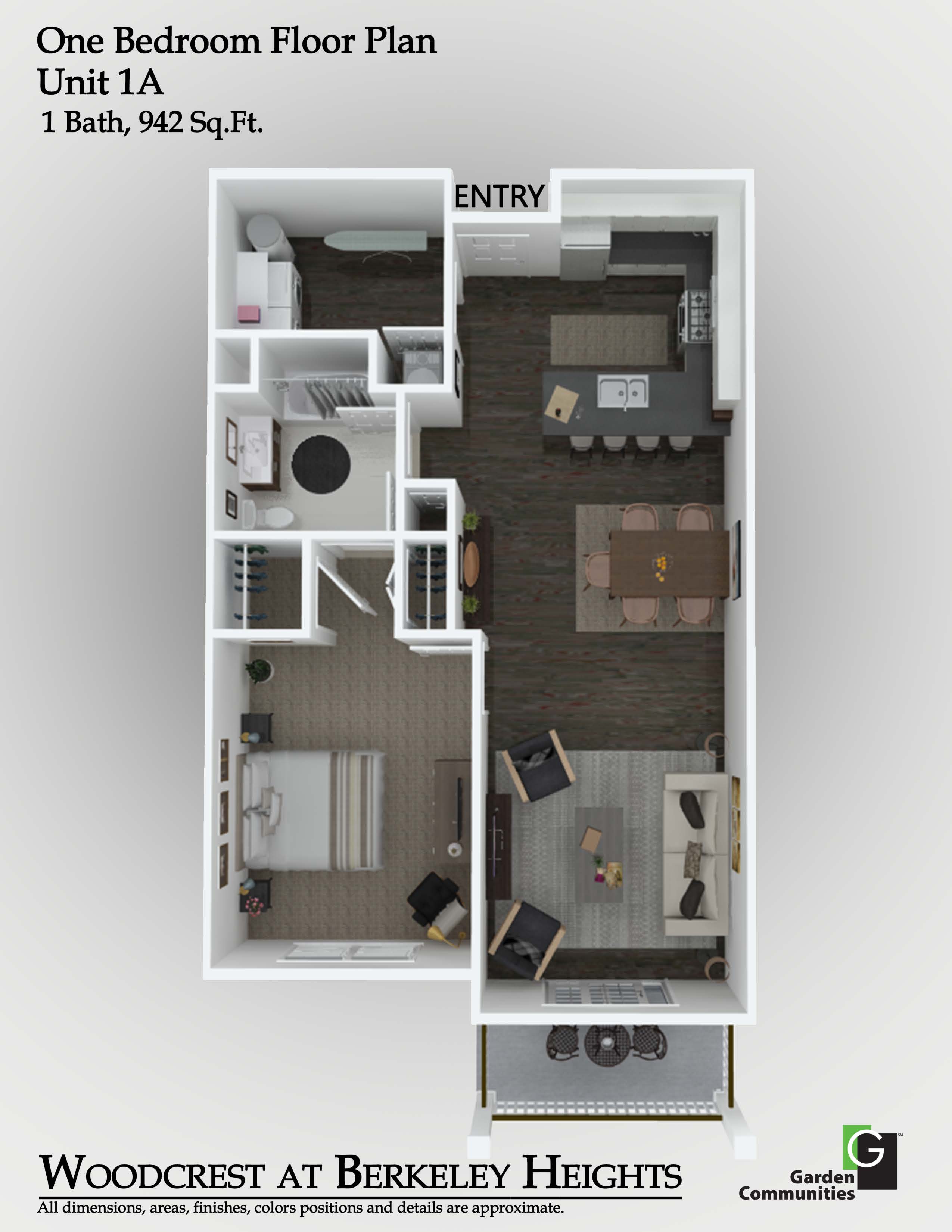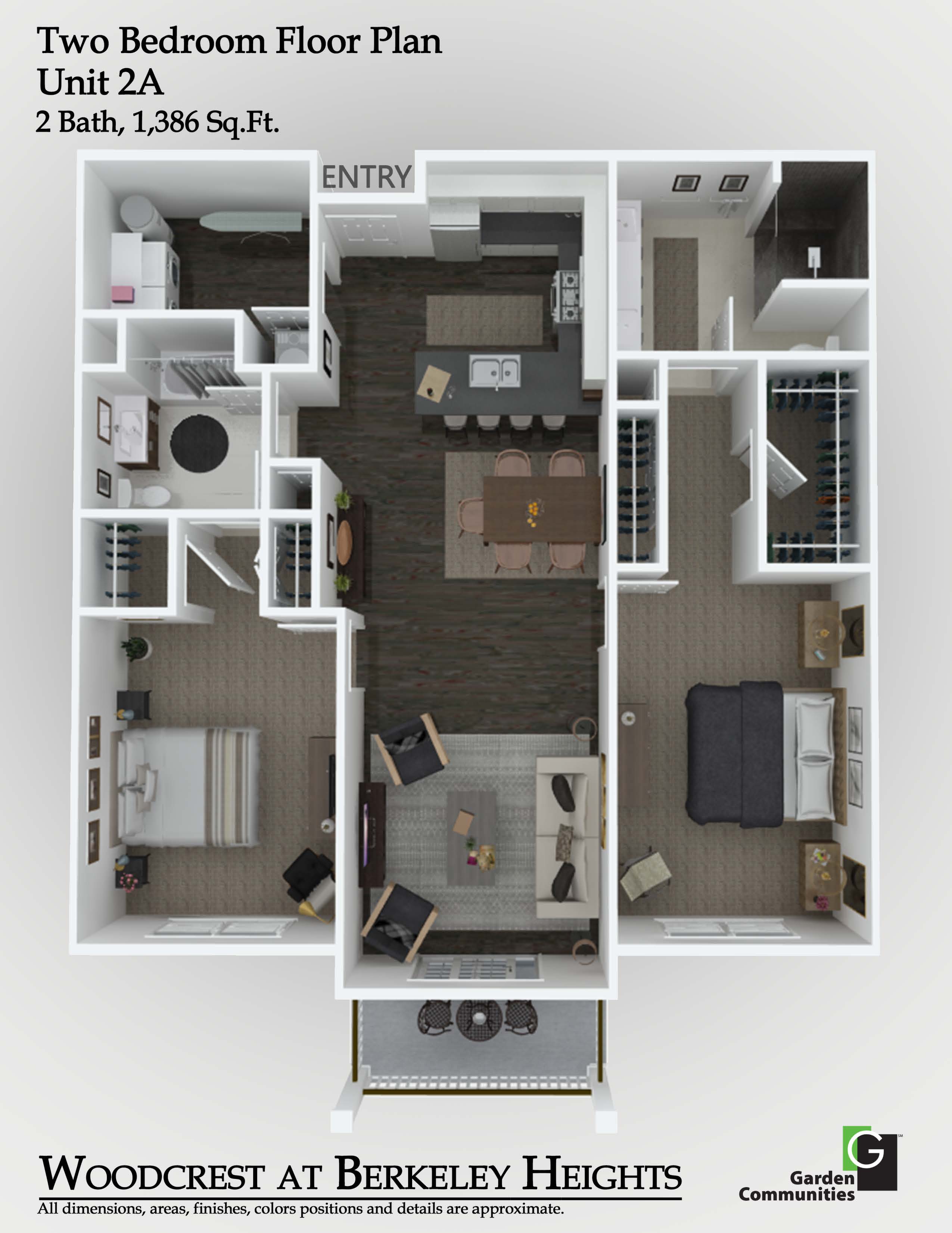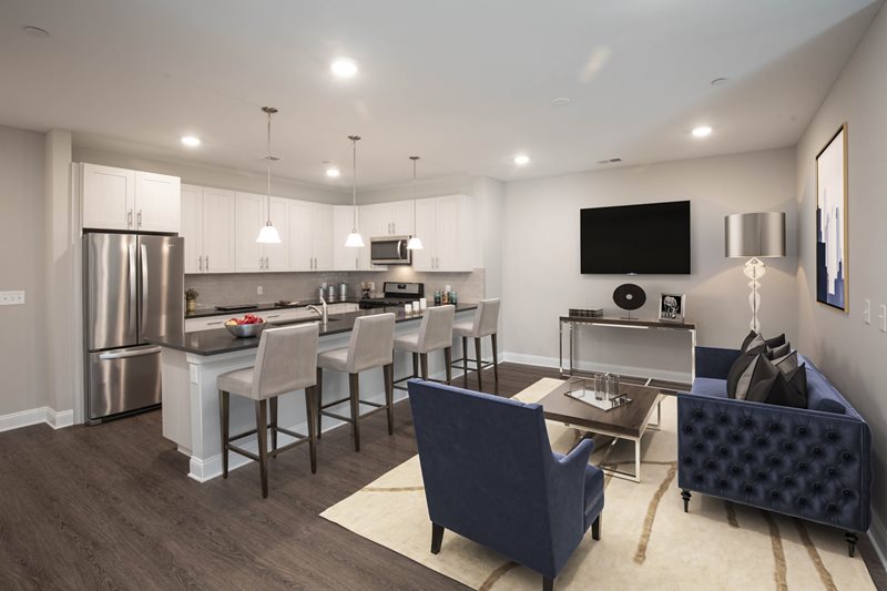 Each residence at Woodcrest at Berkeley Heights is meticulously crafted with top-tier features to enhance your lifestyle. Enjoy cooking and dining at the stylish breakfast bar and appreciate the elegance of quartz kitchen countertops and stainless steel appliances. The living room opens to a private balcony or patio, perfect for relaxation. Voluminous 9' high ceilings and wood plank flooring add to the sense of space and luxury, while carpeted bedrooms ensure comfort. The primary suite boasts a double sink, and select layouts offer generous walk-in closets. Each apartment also includes a convenient in-suite washer and dryer and resident-controlled central air and heat.